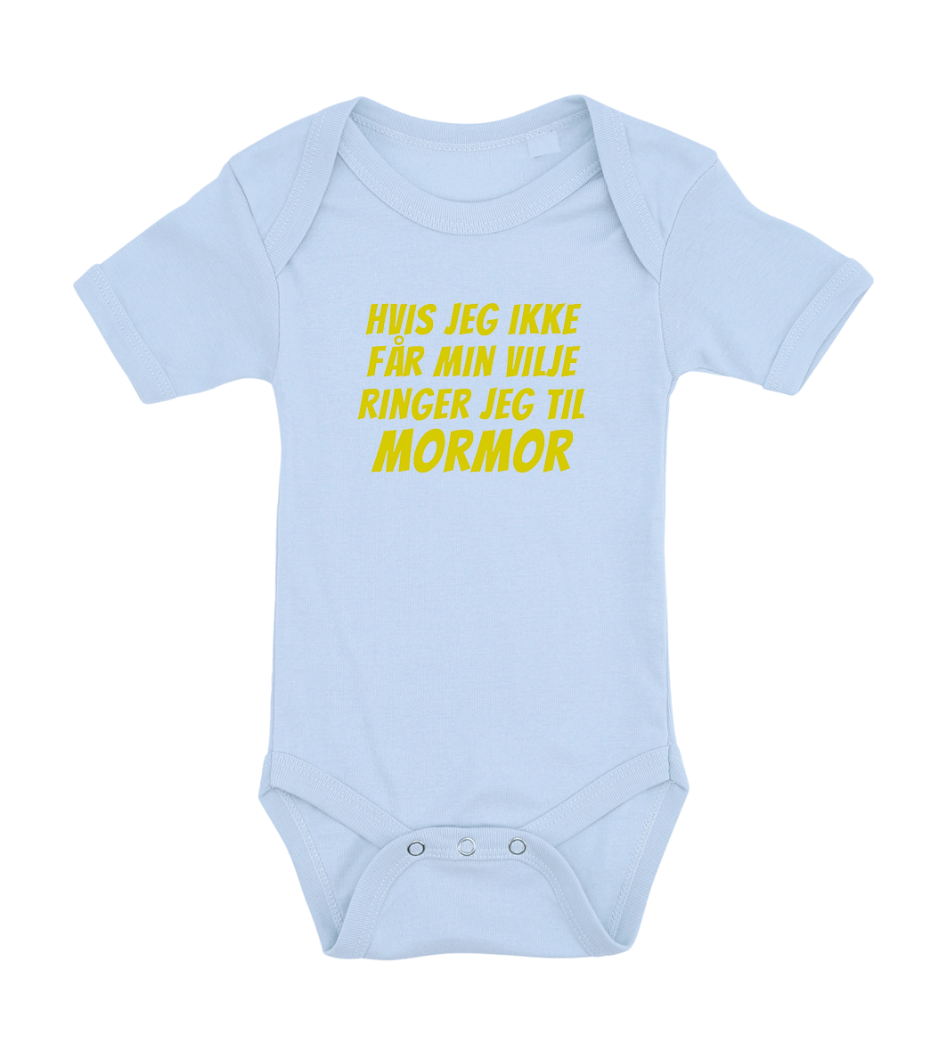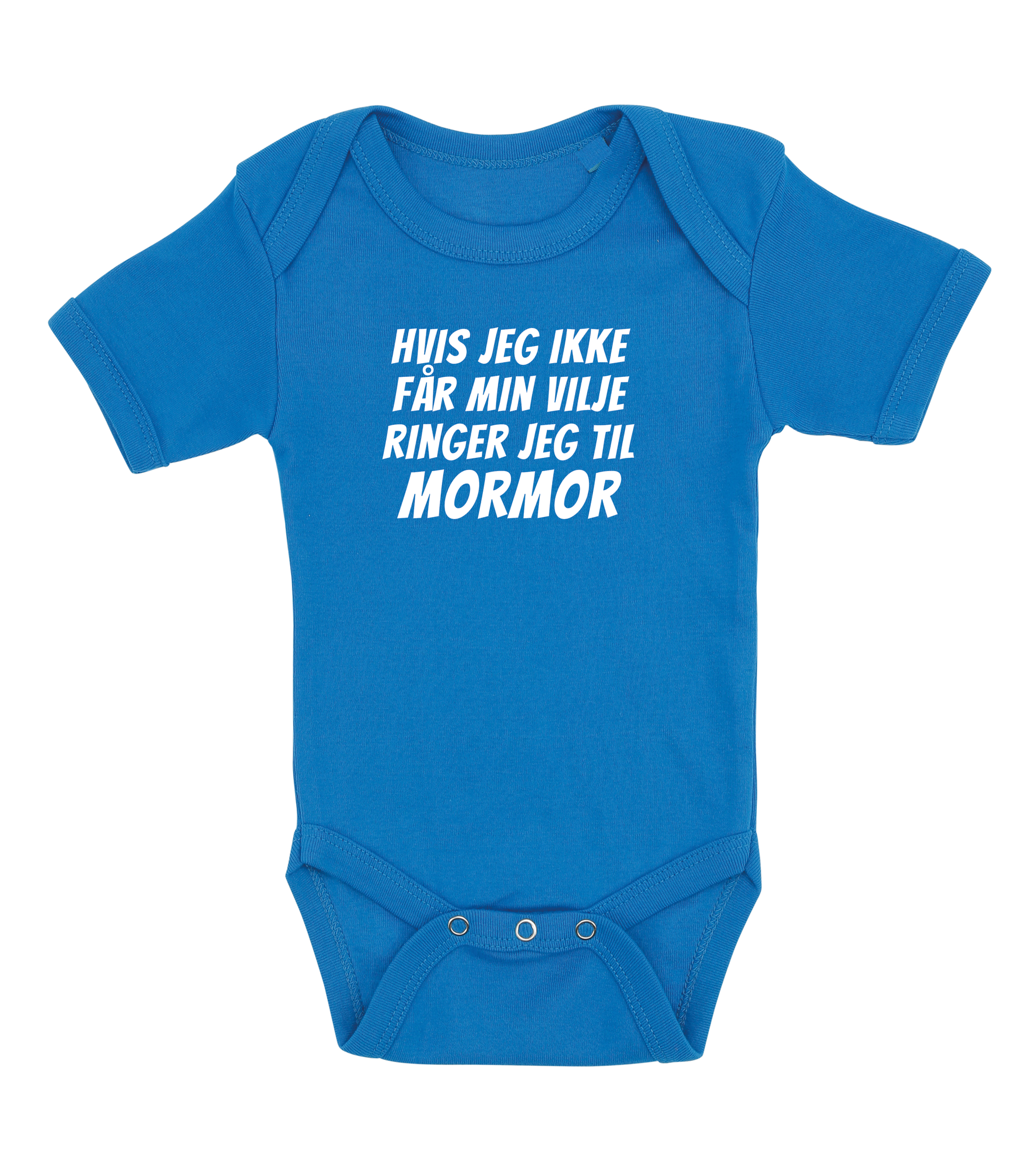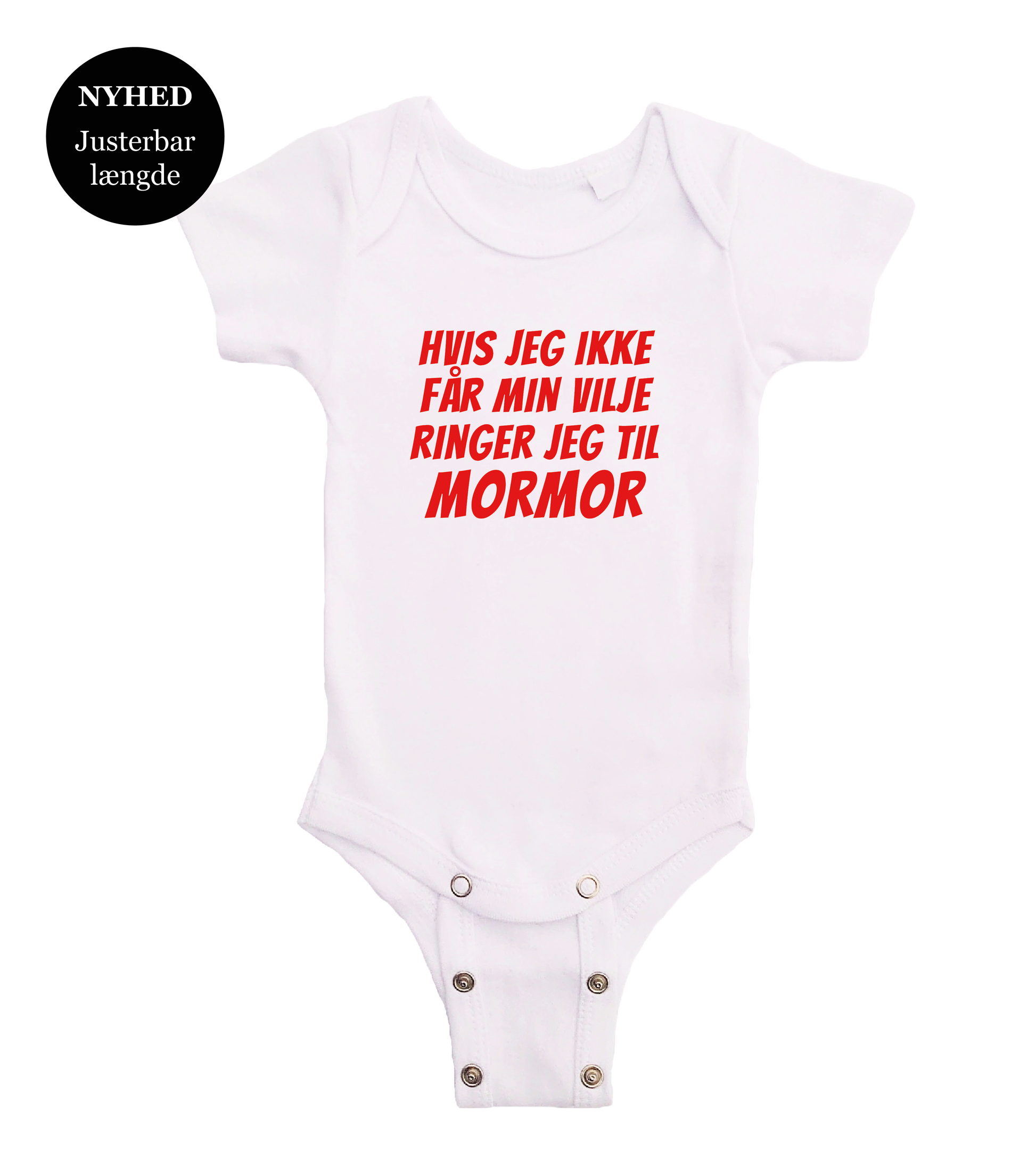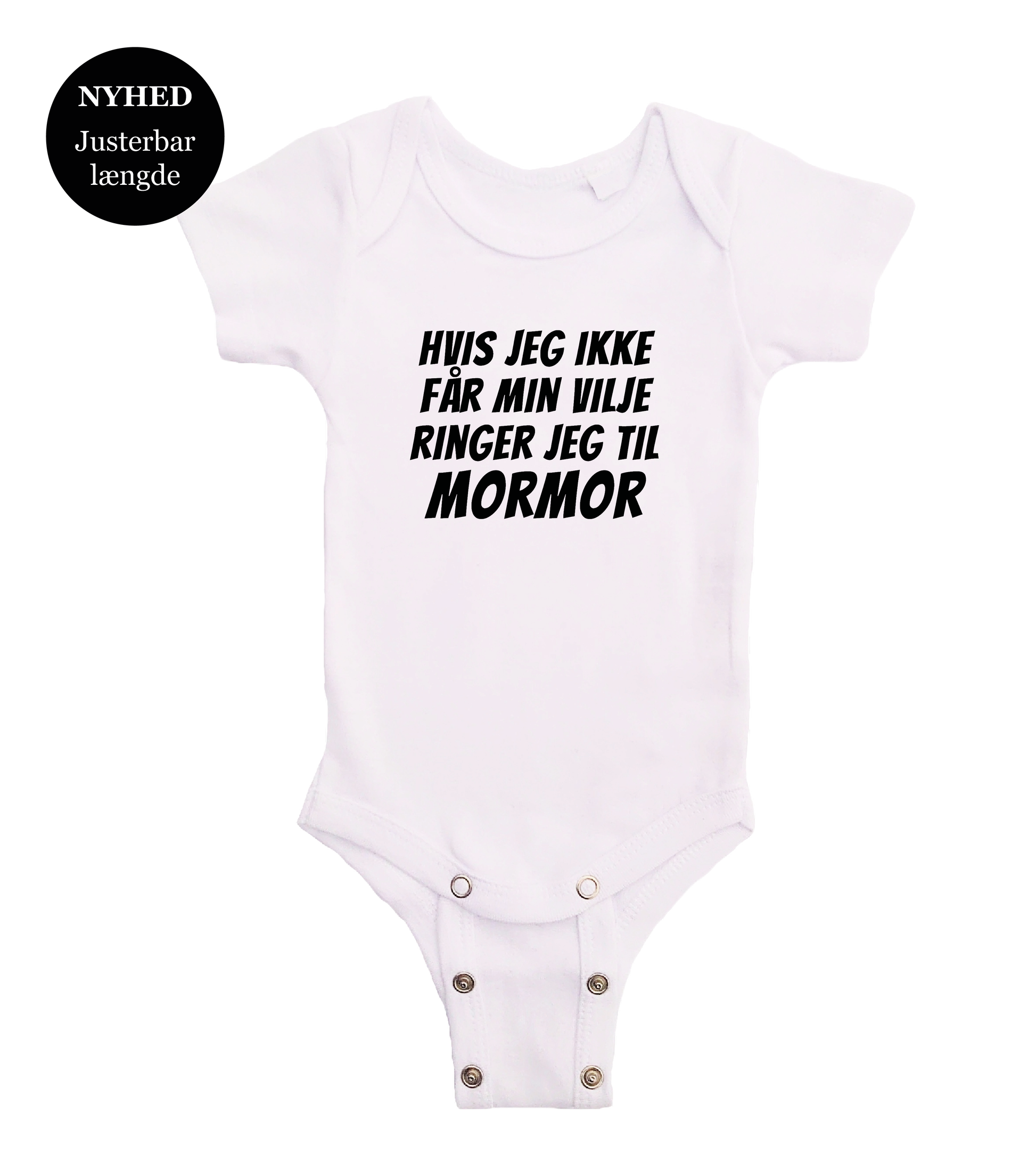 Denne baby bodystocking med teksten Hvis jeg ikke får min vilje ringer jeg til mormor, er det perfekte køb til de kommende forældre der kan lide sjove bodystockings