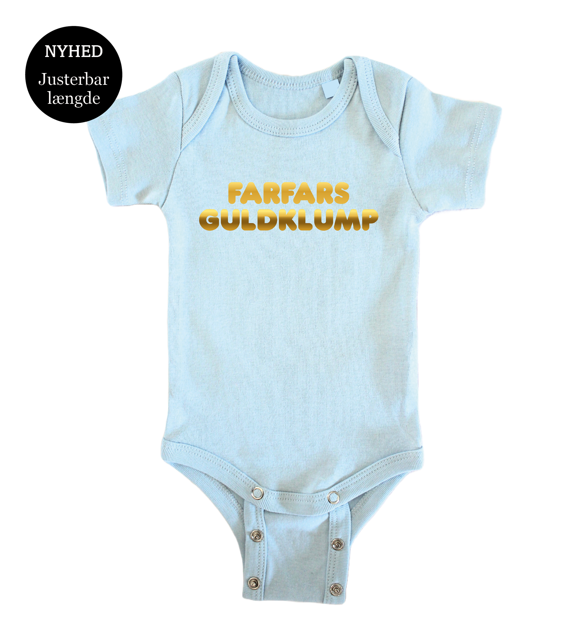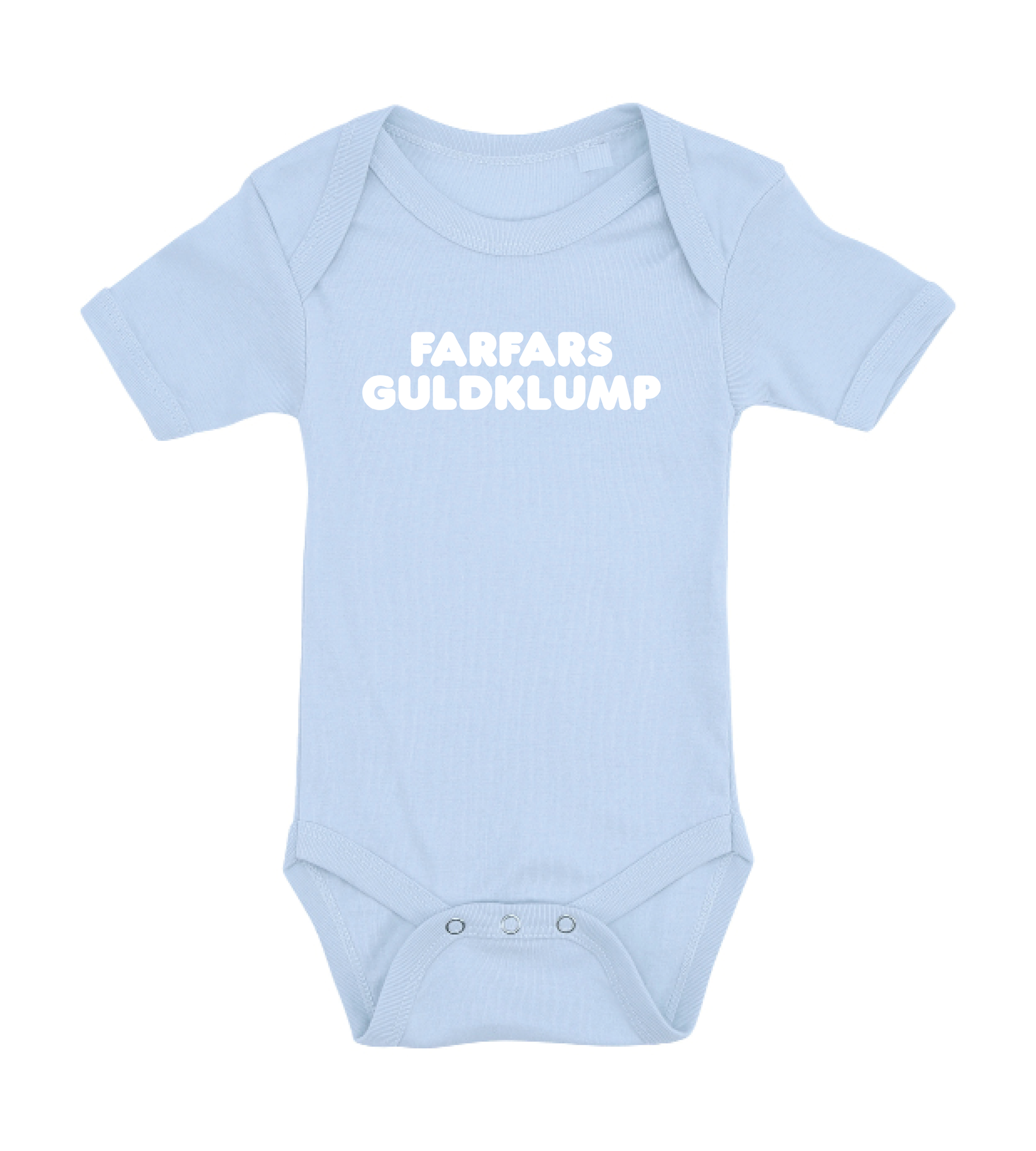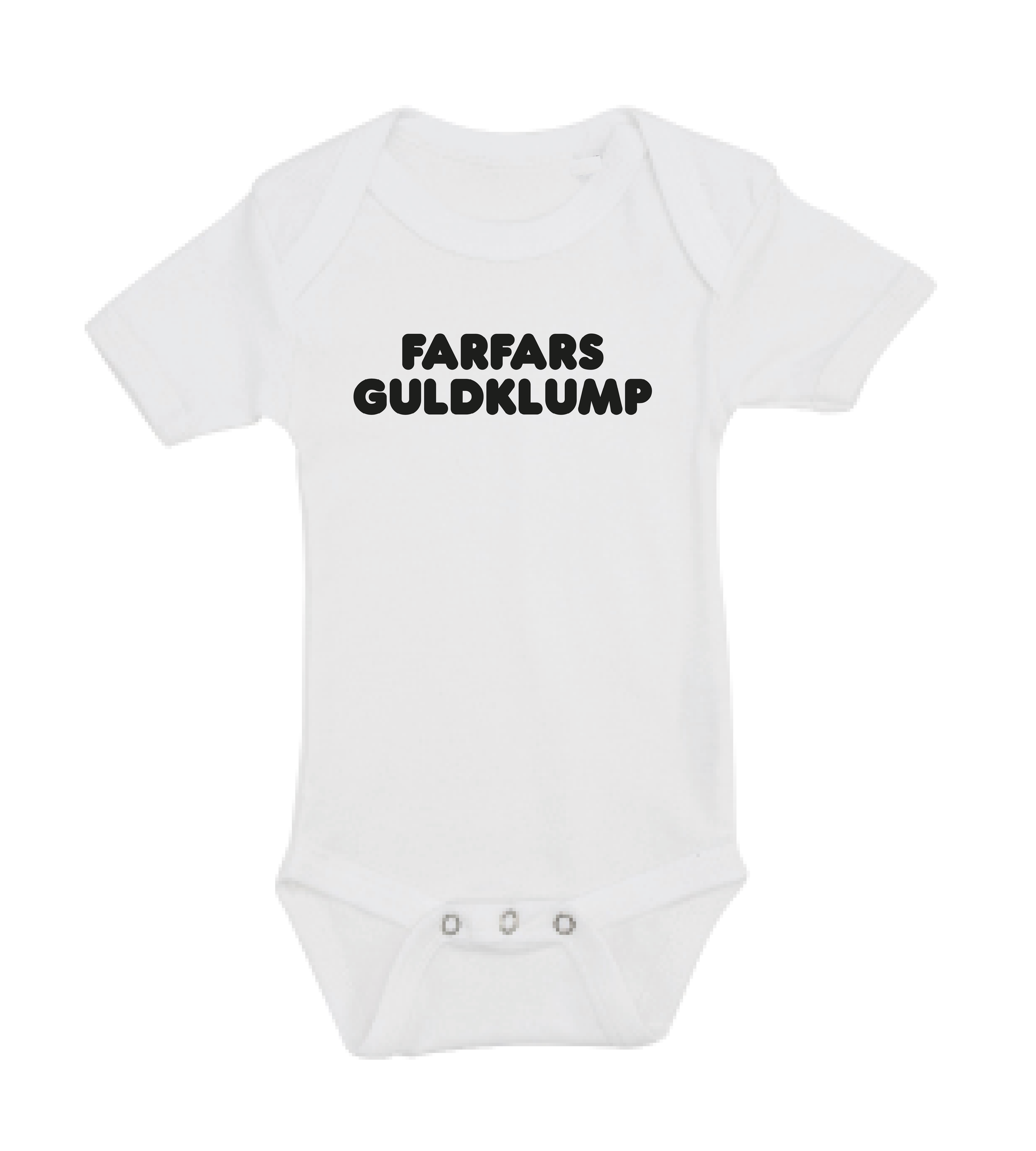 Denne baby bodystocking med teksten Farfars guldklump, er det perfekte køb til de kommende forældre, som venter sig en lille baby , som vil blive familiens guldklump, eller gave fra den stolte farfar.
