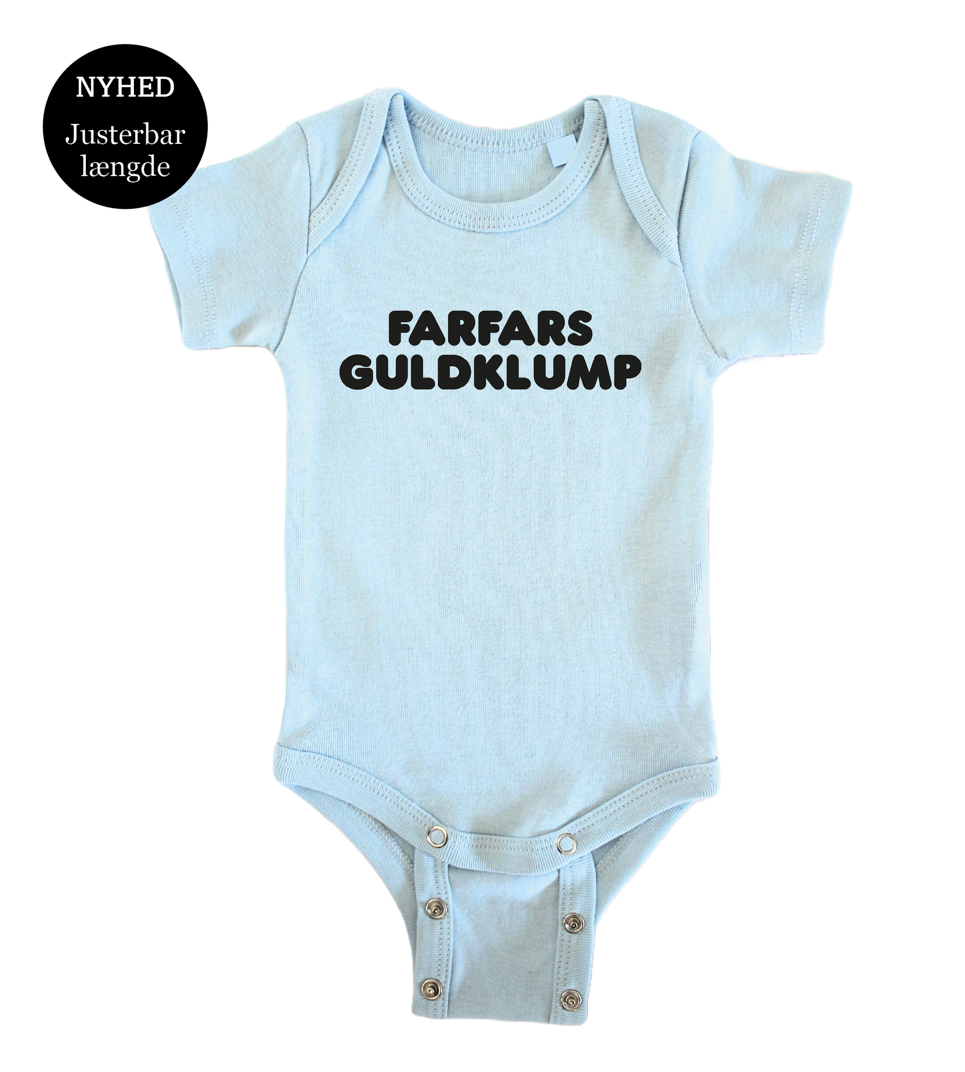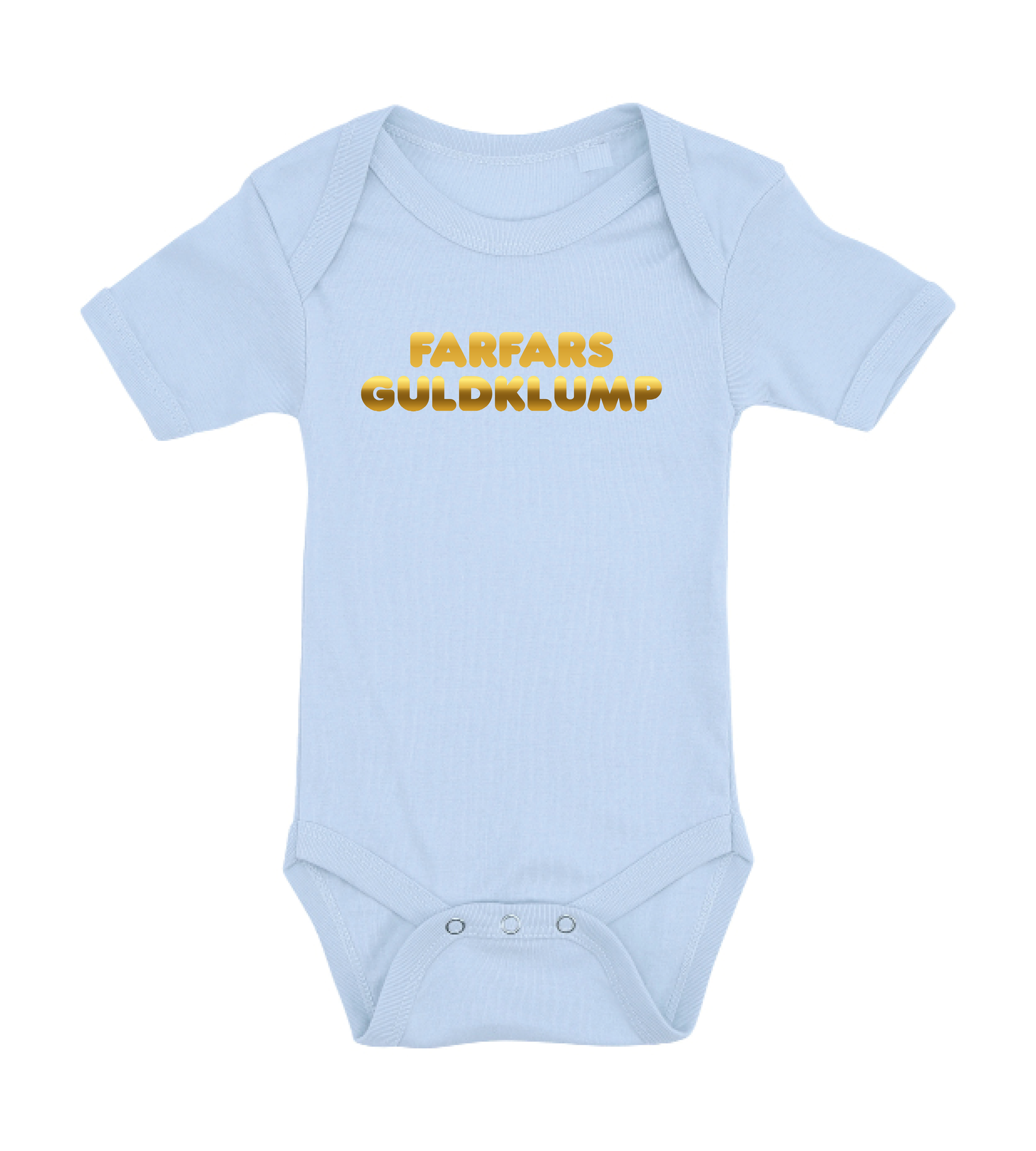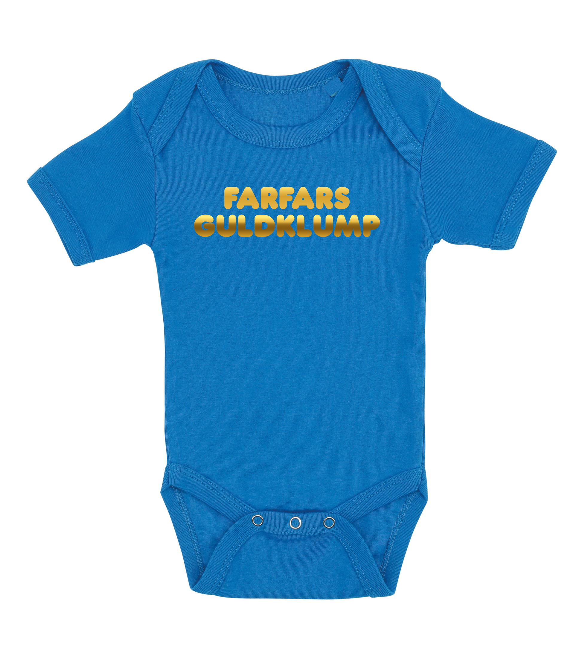 Denne baby bodystocking med teksten Farfars guldklump, er det perfekte køb til de kommende forældre, som venter sig en lille baby , som vil blive familiens guldklump, eller gave fra den stolte farfar.