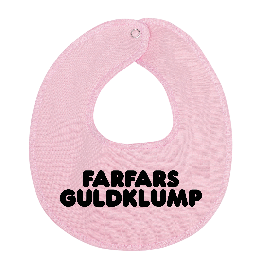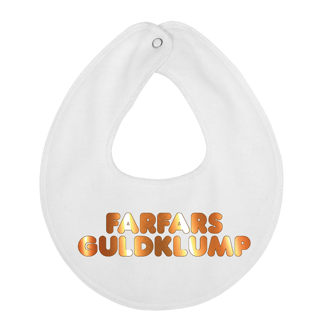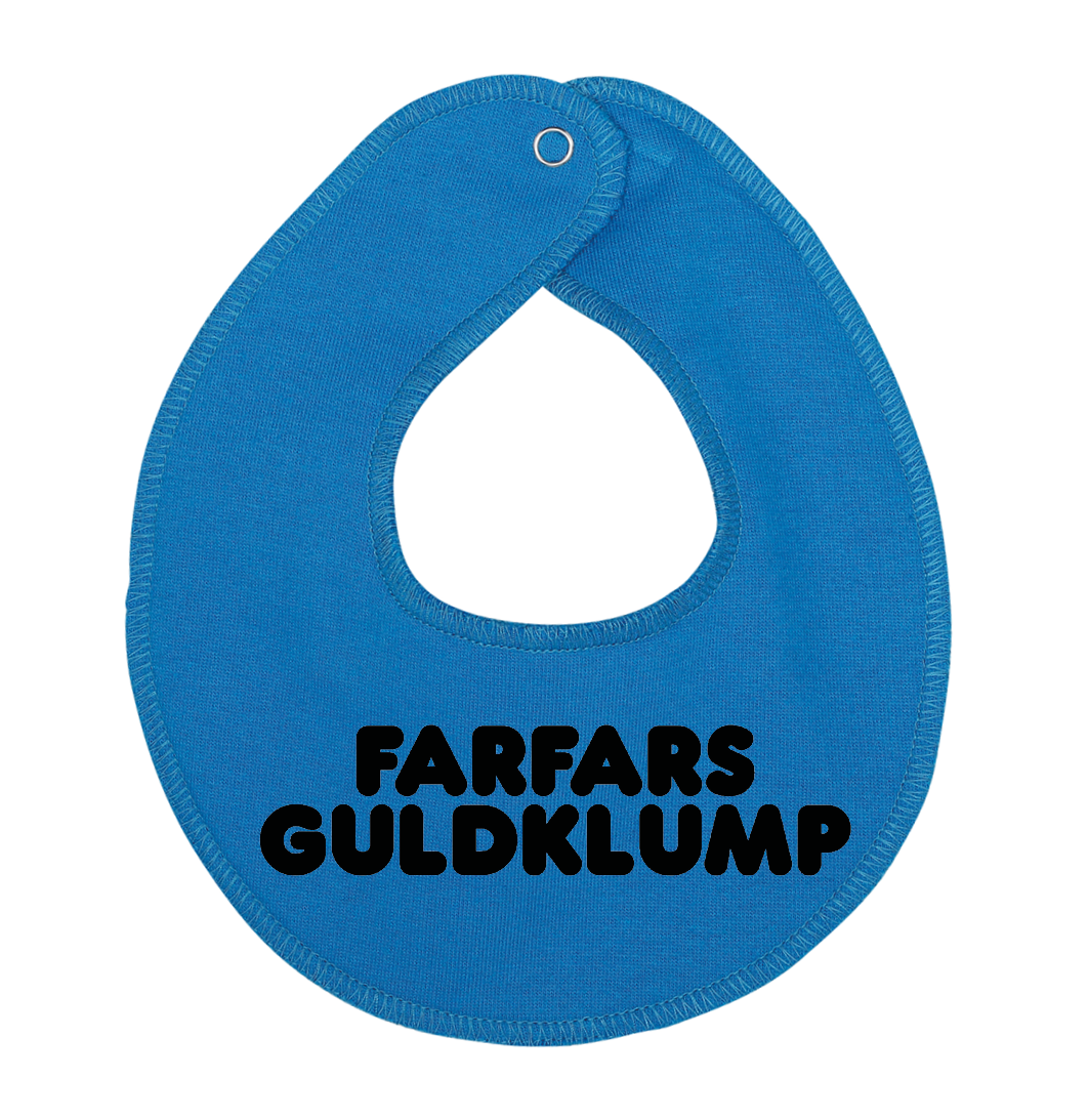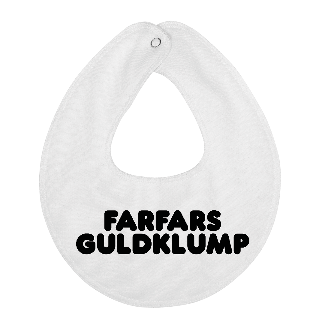 Denne hagesmæk / savlesmæk med teksten Farfars guldklump, er det perfekte køb til de kommende forældre, som venter sig en lille baby , som vil blive familiens guldklump, eller gave fra den stolte farfar.