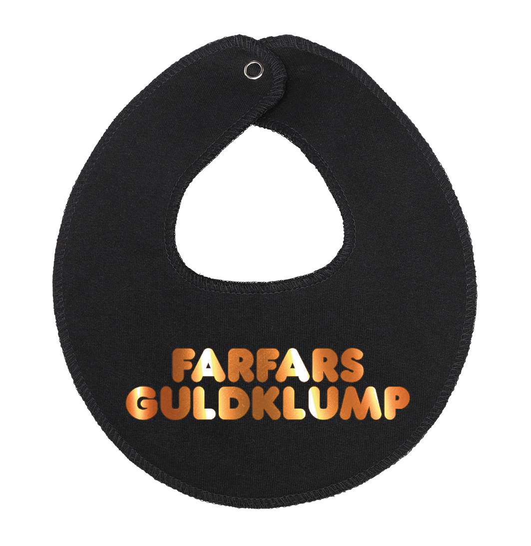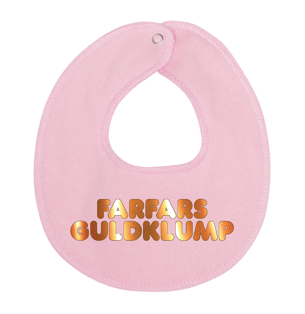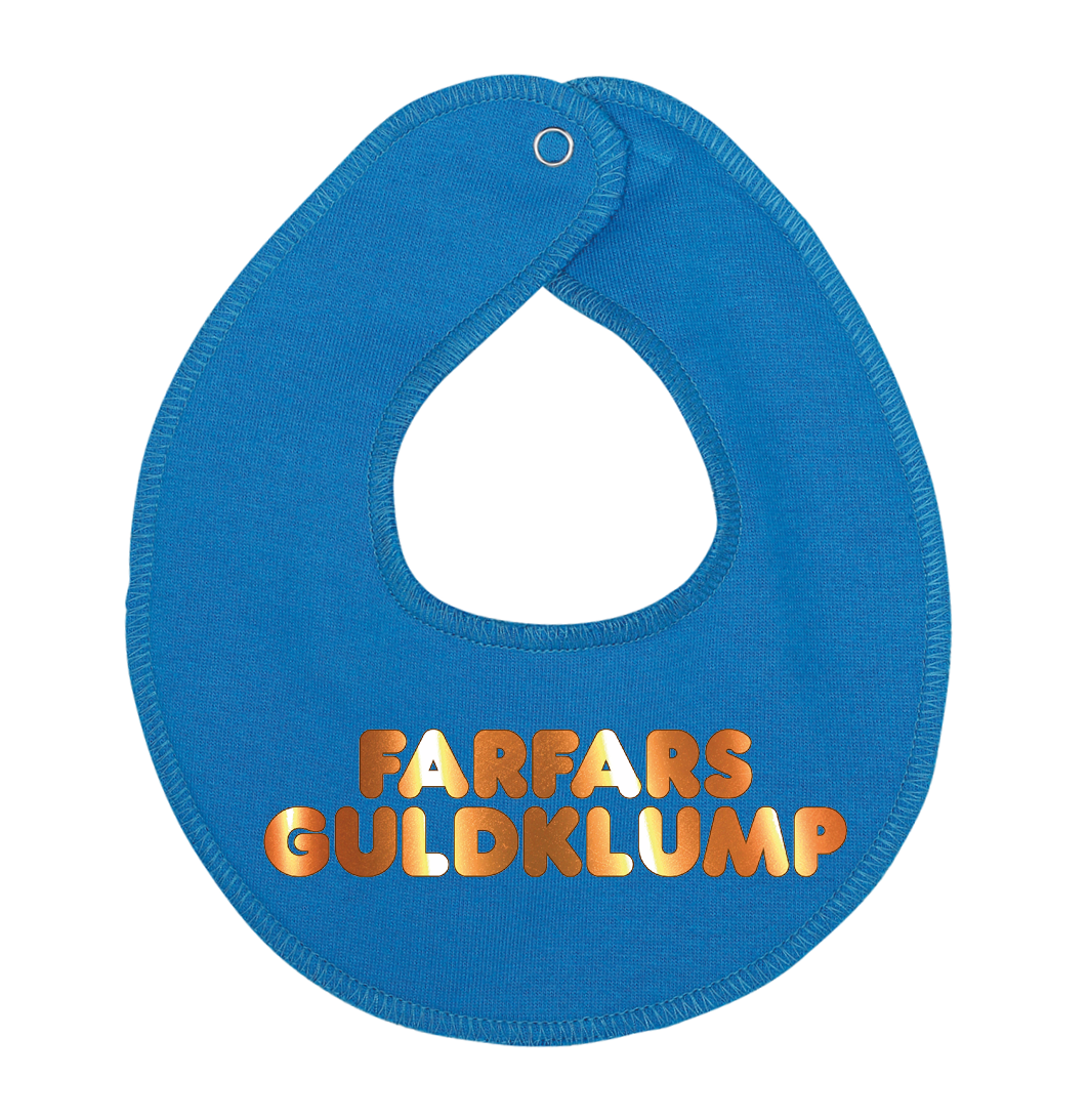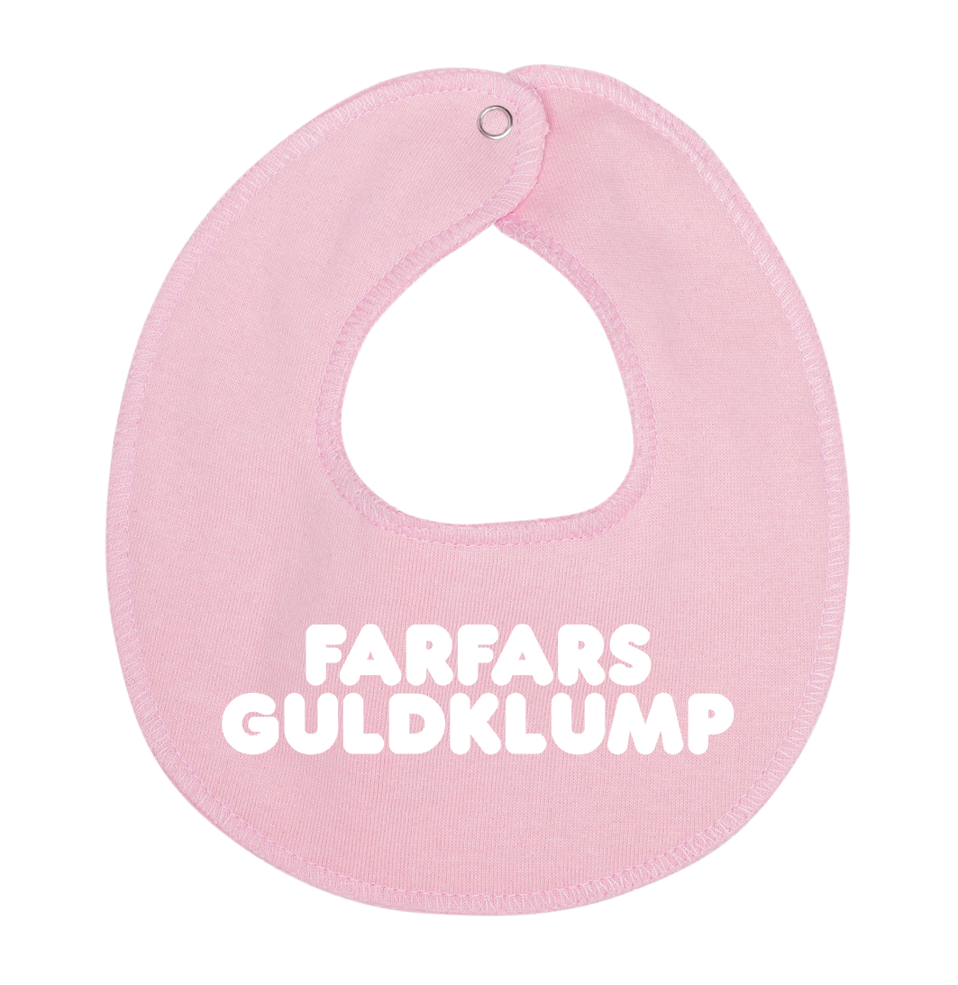 Denne hagesmæk / savlesmæk med teksten Farfars guldklump, er det perfekte køb til de kommende forældre, som venter sig en lille baby , som vil blive familiens guldklump, eller gave fra den stolte farfar.