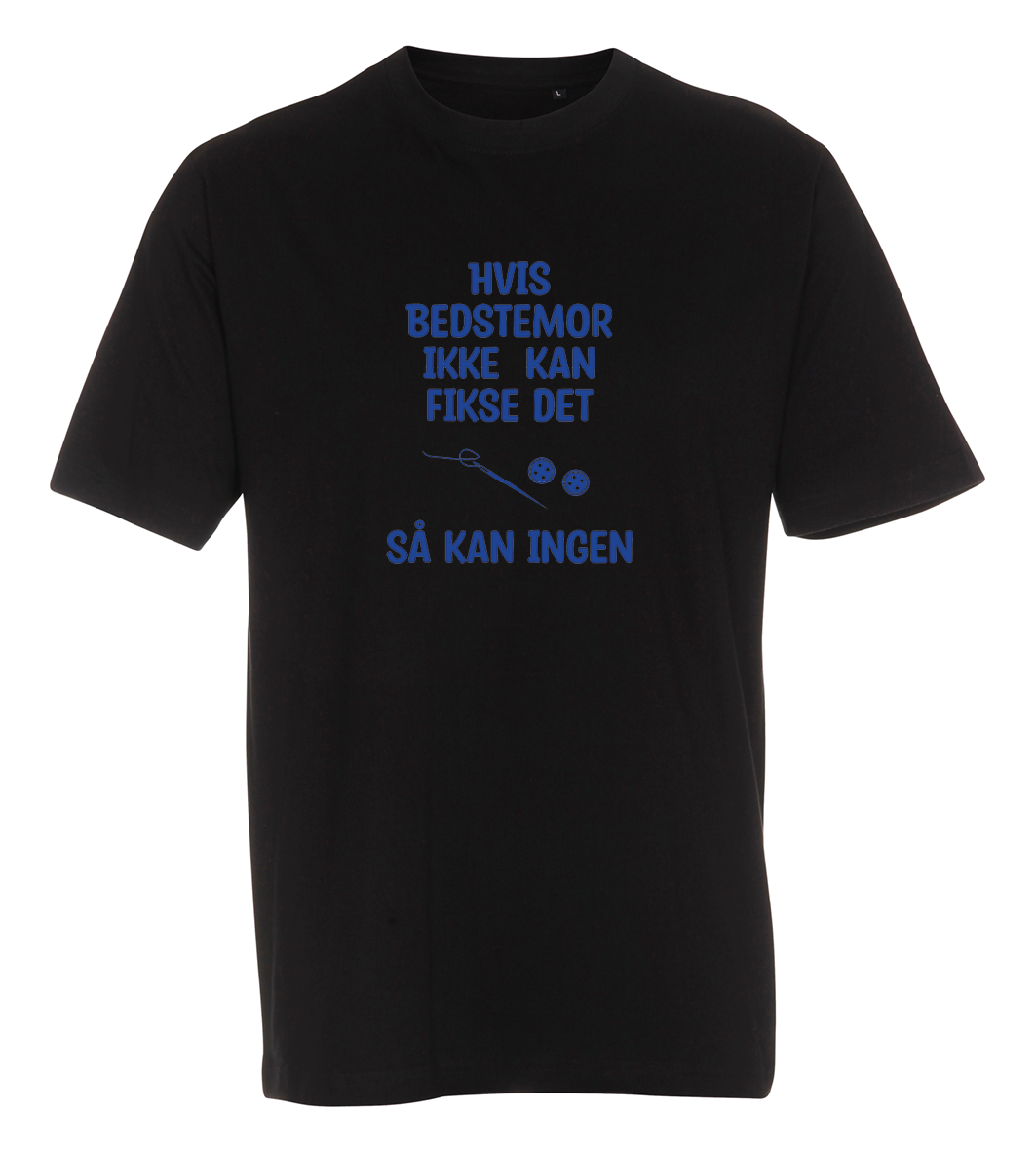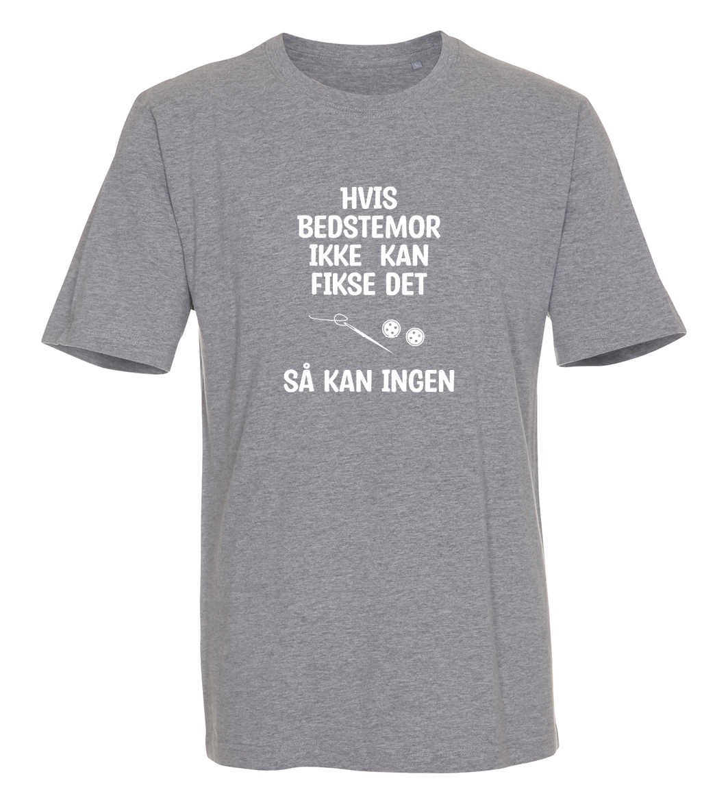 Denne T-shirt med teksten Hvis ikke bedstemor kan fikse det så kan ingen, er den perfekte t-shirt til bedstemor som kan fikse alt med nål og tråd
