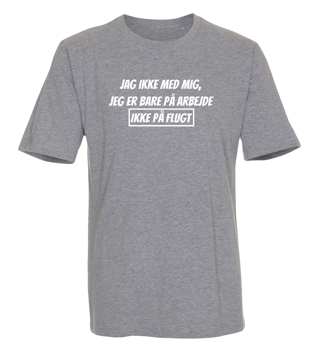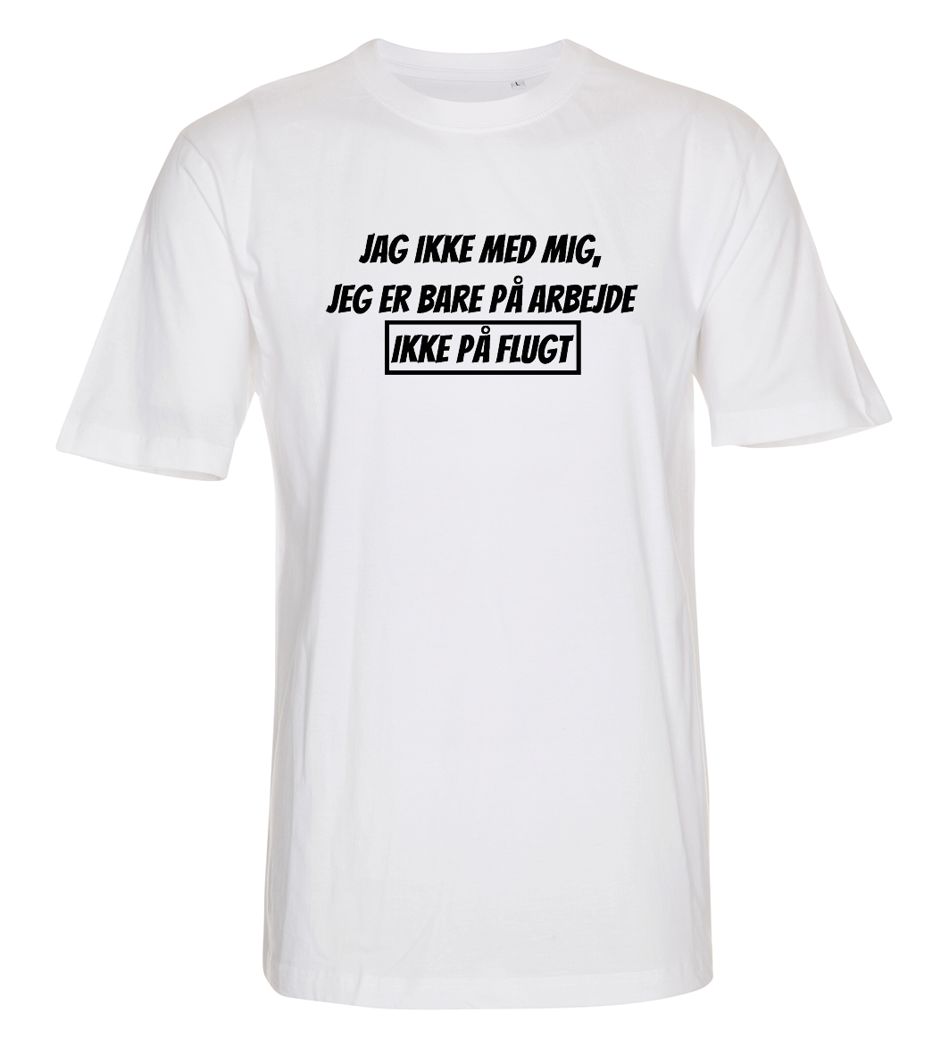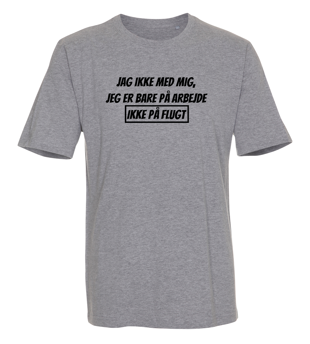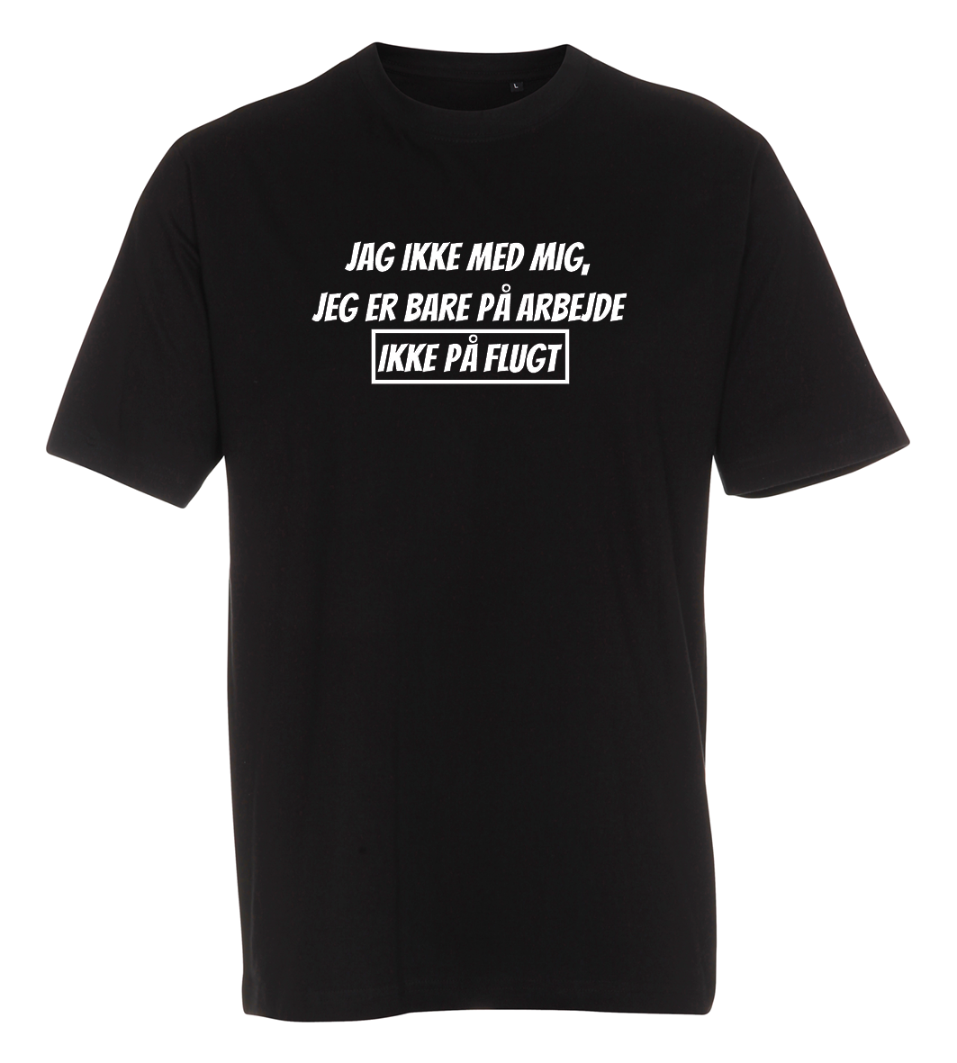 Denne T-shirt med teksten jag ikke med mig, jeg er bare på arbejde ikke på flugt er det sjoveste køb til dig selv for at tage "pis" på dine kolleager eller som gave til en kollega du godt kan lide at lave sjov med.