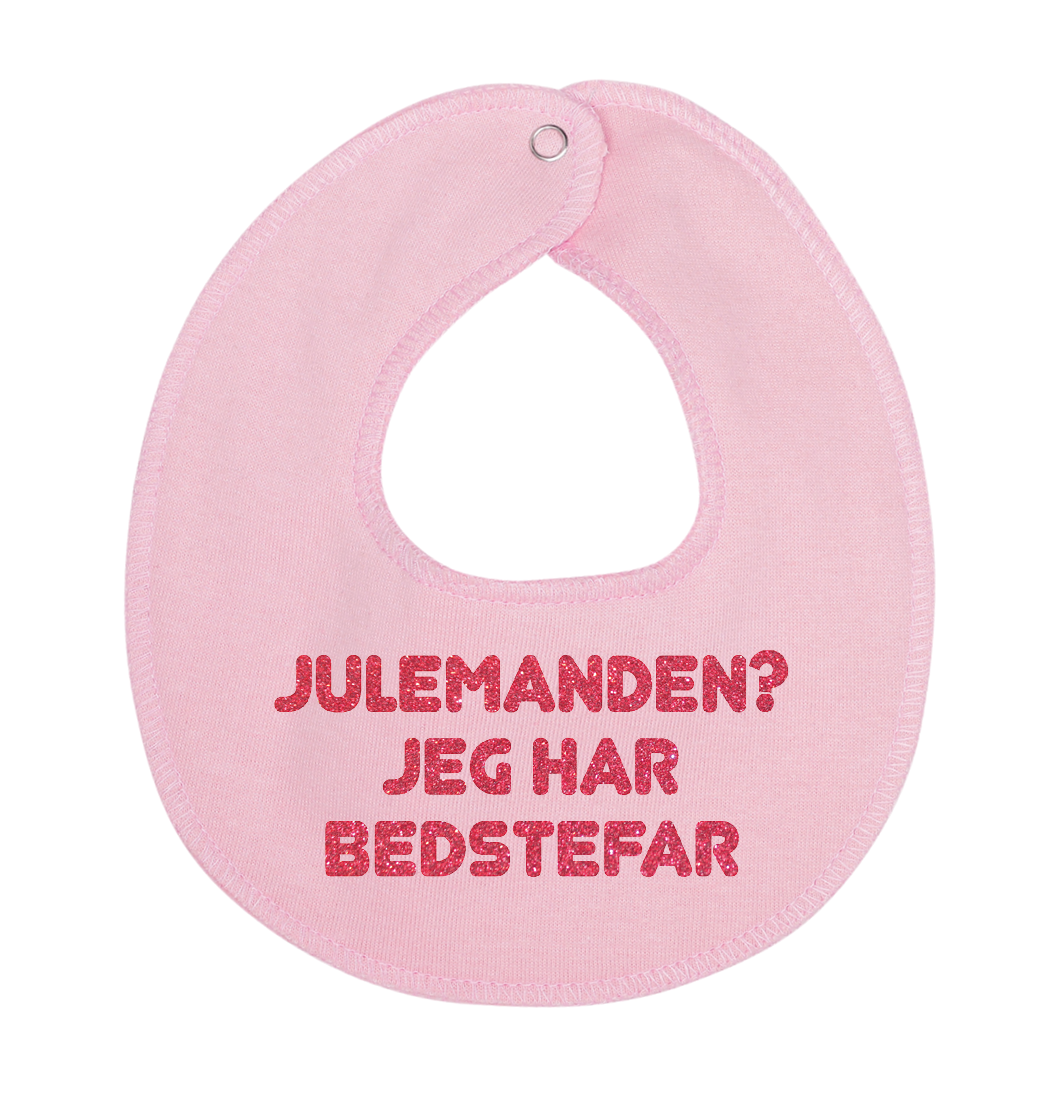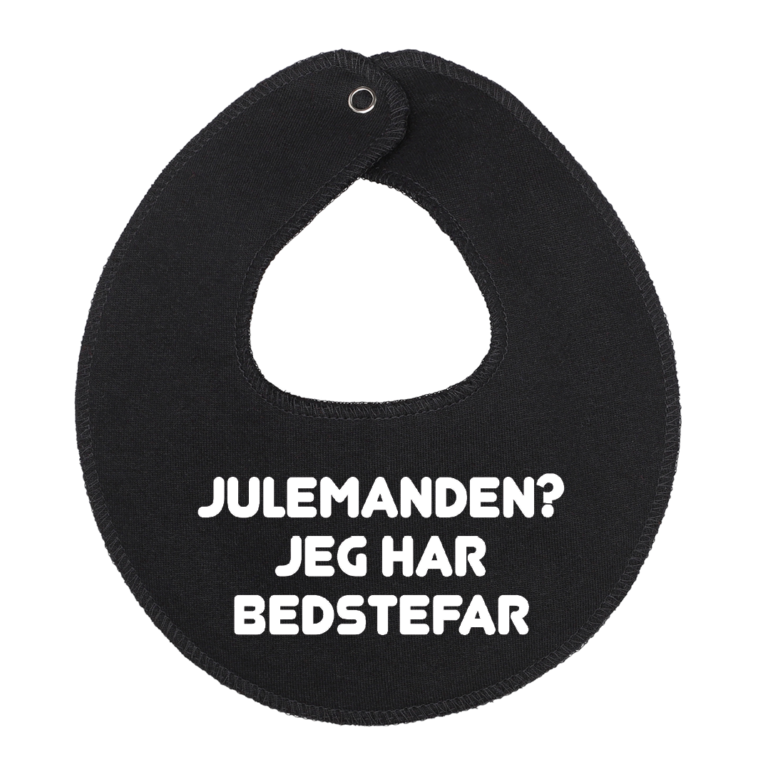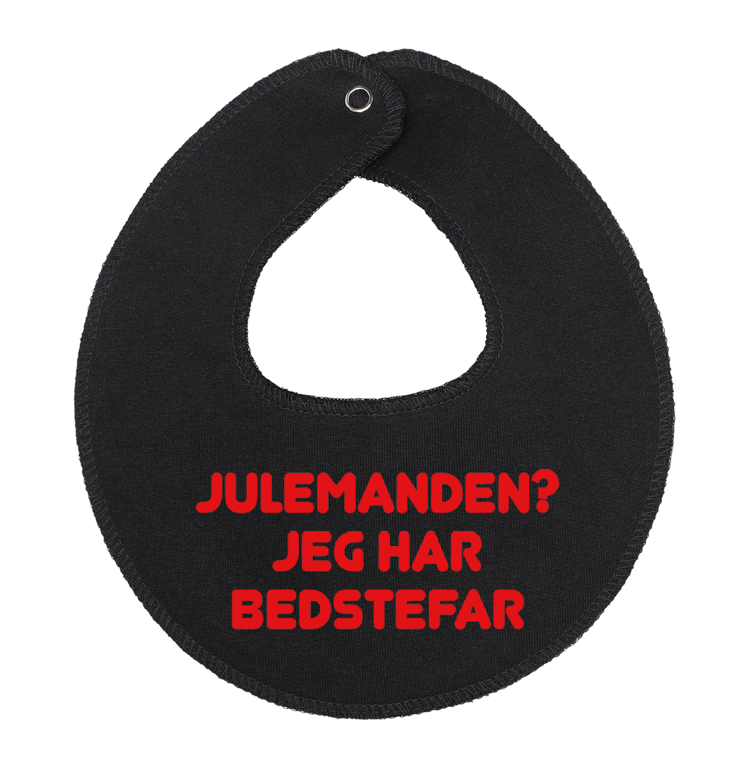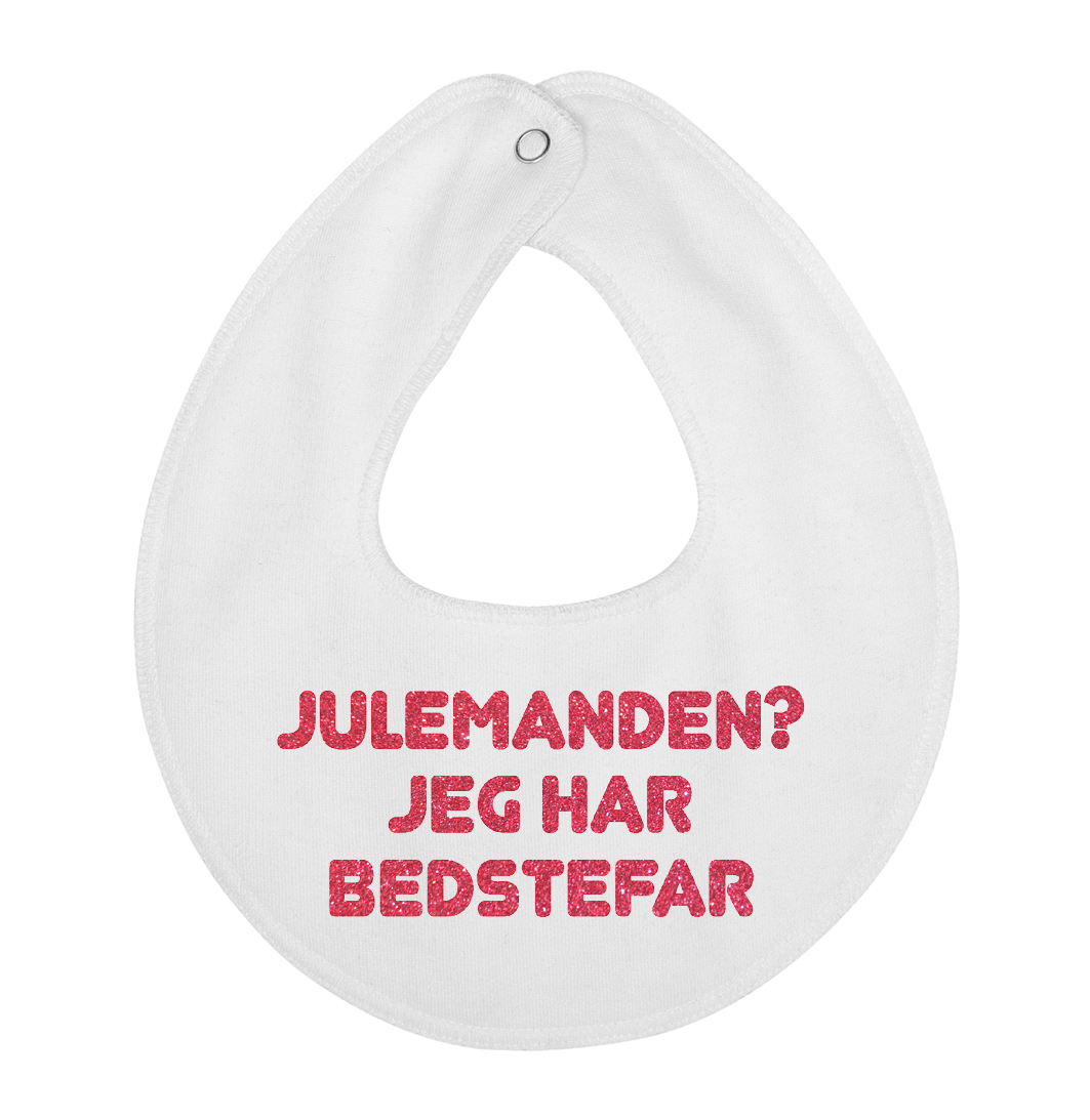 Denne jule hagesmæk / jule savlesmæk med teksten Julemanden? jeg har bedstefar, er det perfekte køb til baby som er meget forkælet af sin bedstefar.