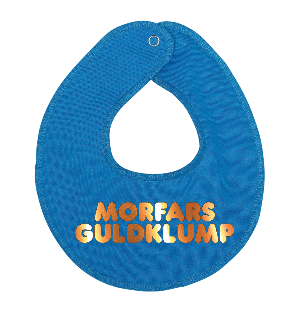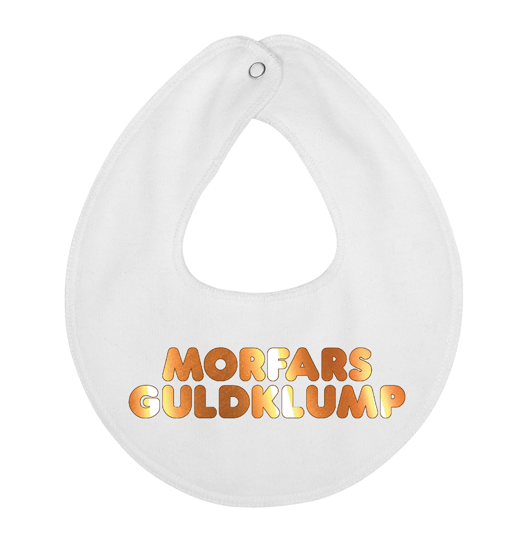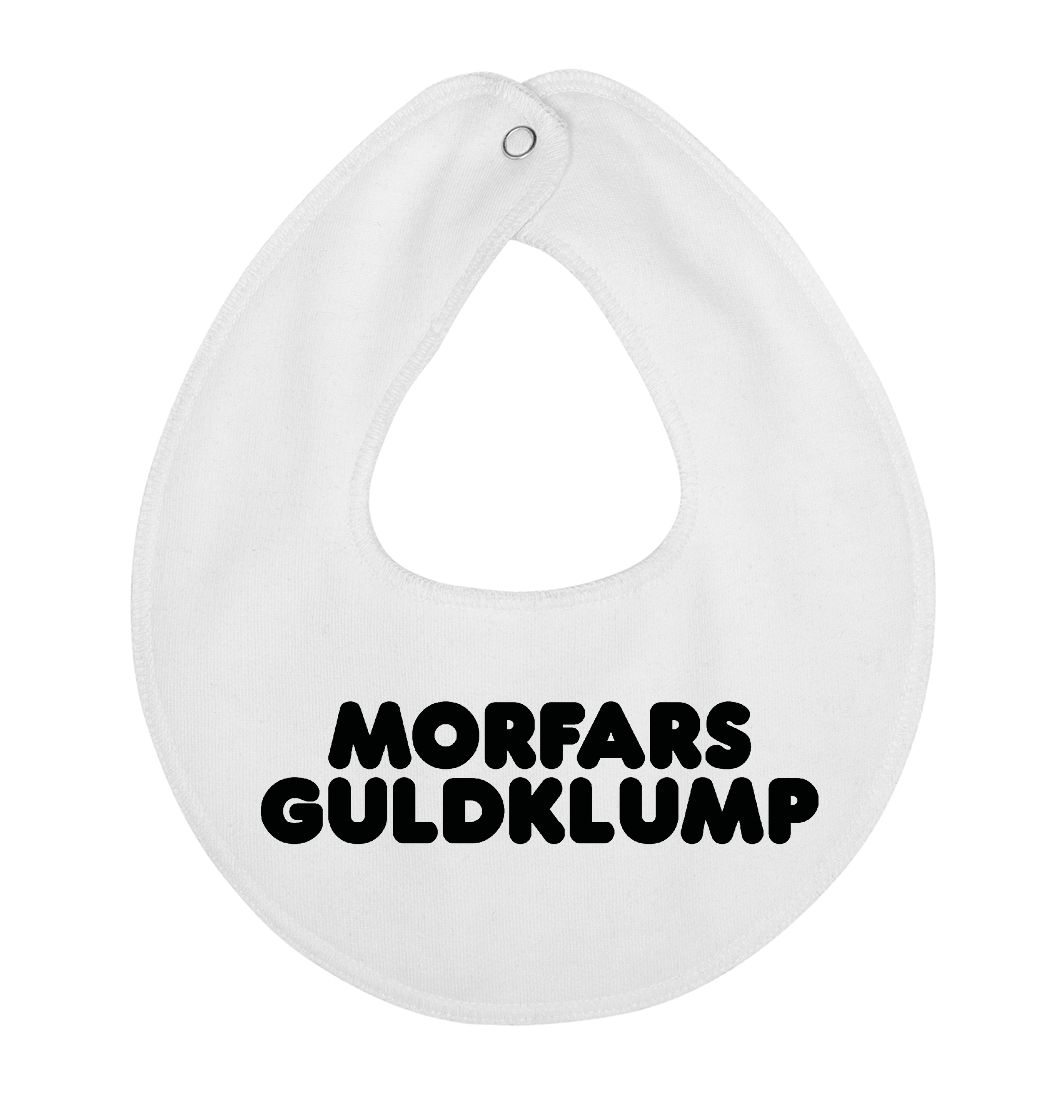 Denne hagesmæk / savlesmæk med teksten Morfars guldklump, er det perfekte køb til de kommende forældre, som venter sig en lille baby , som vil blive familiens guldklump, eller gave fra den stolte morfar.