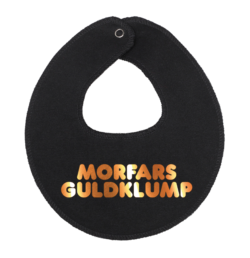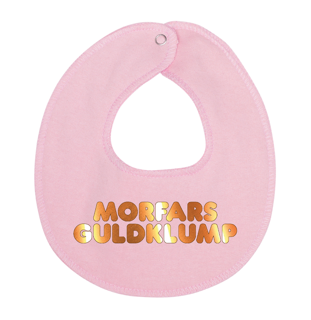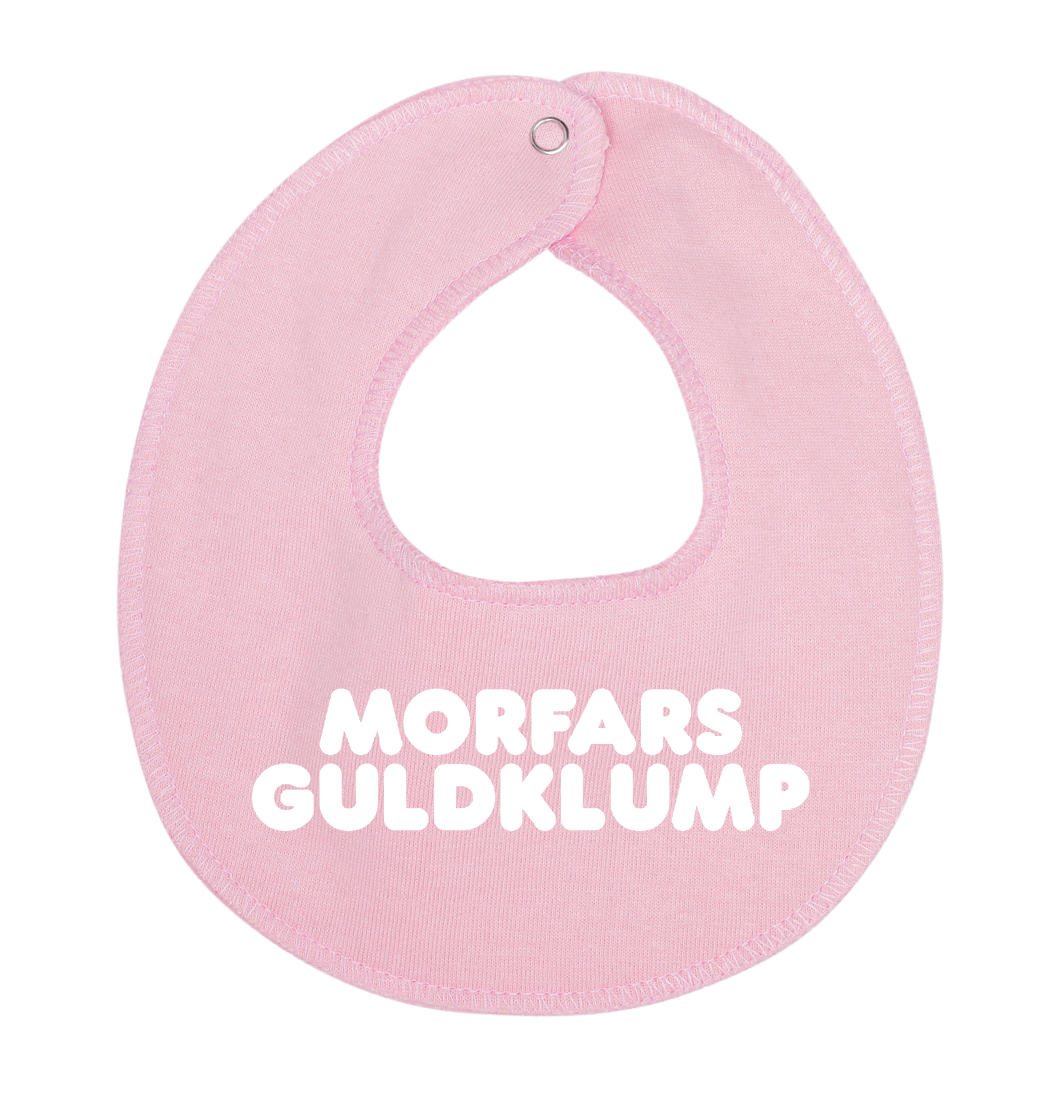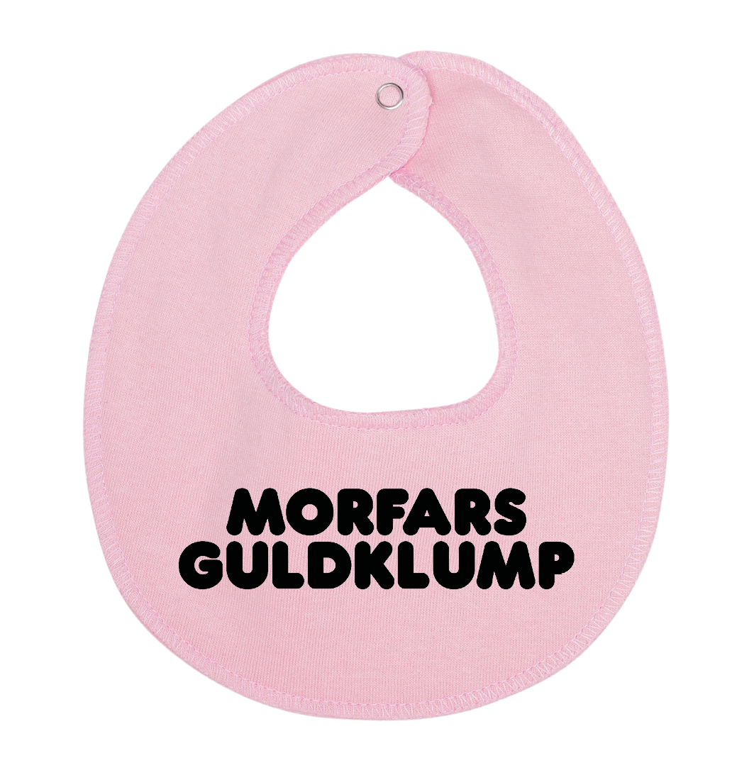 Denne hagesmæk / savlesmæk med teksten Morfars guldklump, er det perfekte køb til de kommende forældre, som venter sig en lille baby , som vil blive familiens guldklump, eller gave fra den stolte morfar.