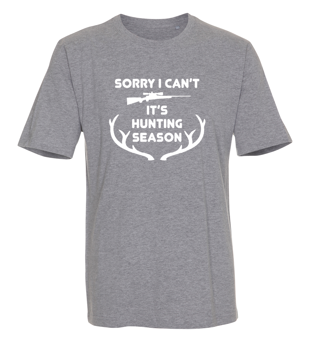 Denne T-shirt med teksten sorry i cant its hunting season er et sjovt køb til jægeren som tit er på jagt og som kan lide sjove jagt citater.