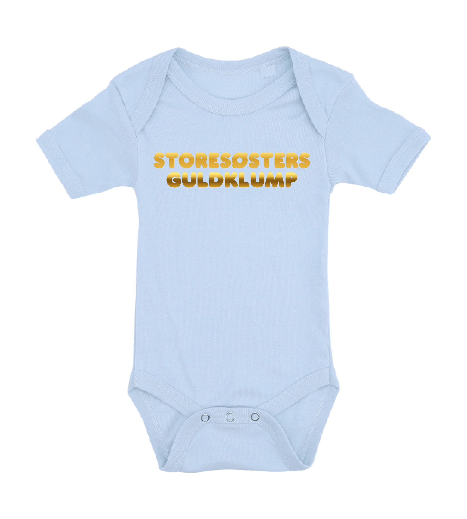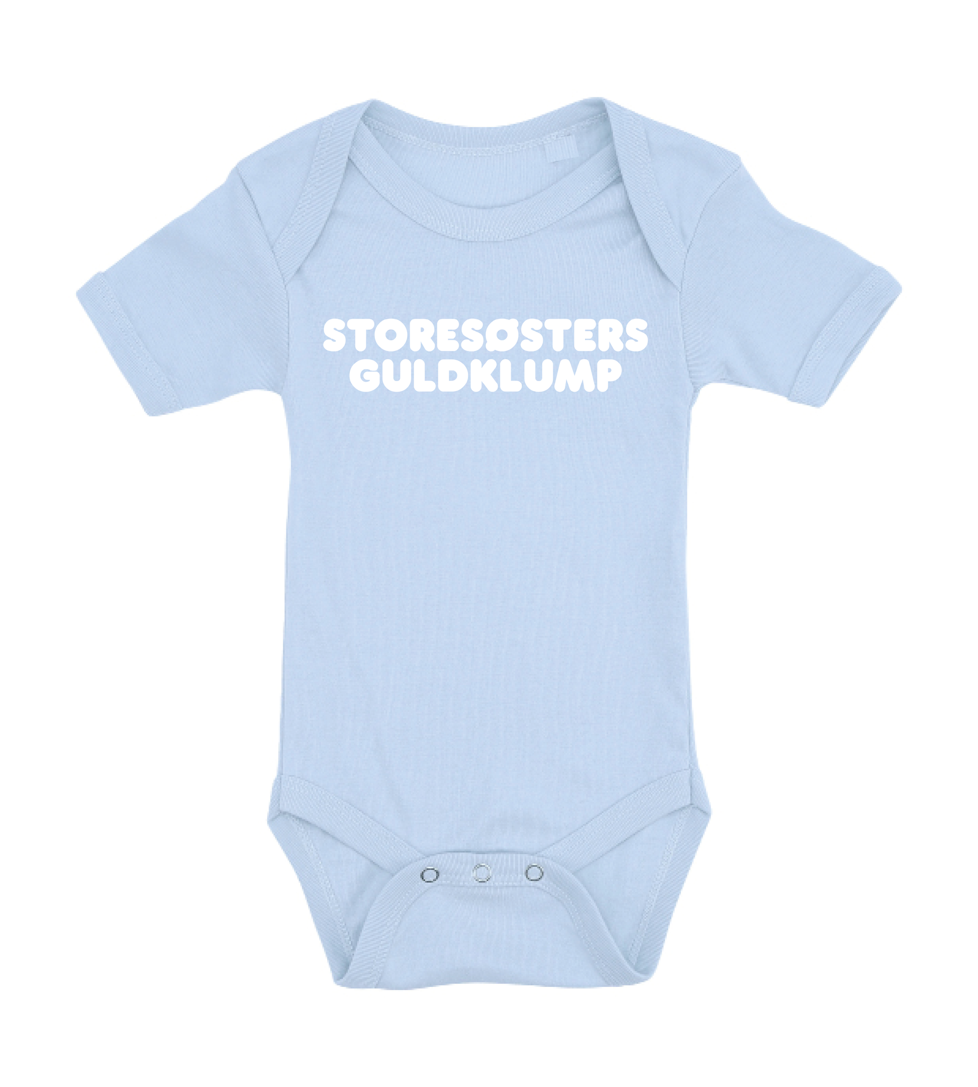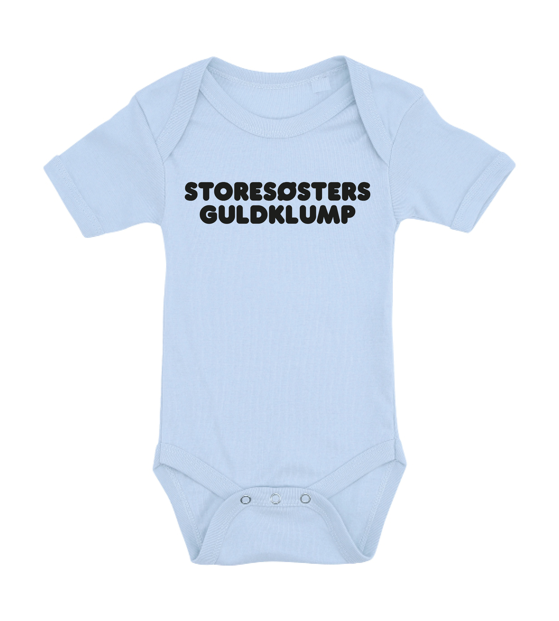 Denne baby bodystocking med teksten Storesøsters guldklump, er det perfekte køb til de kommende forældre, som venter sig en lille baby , som vil blive familiens guldklump, eller gave fra den stolte storesøster.