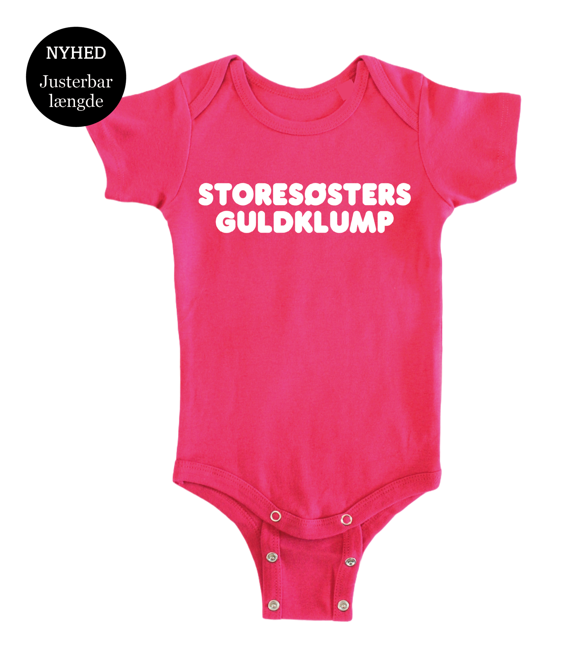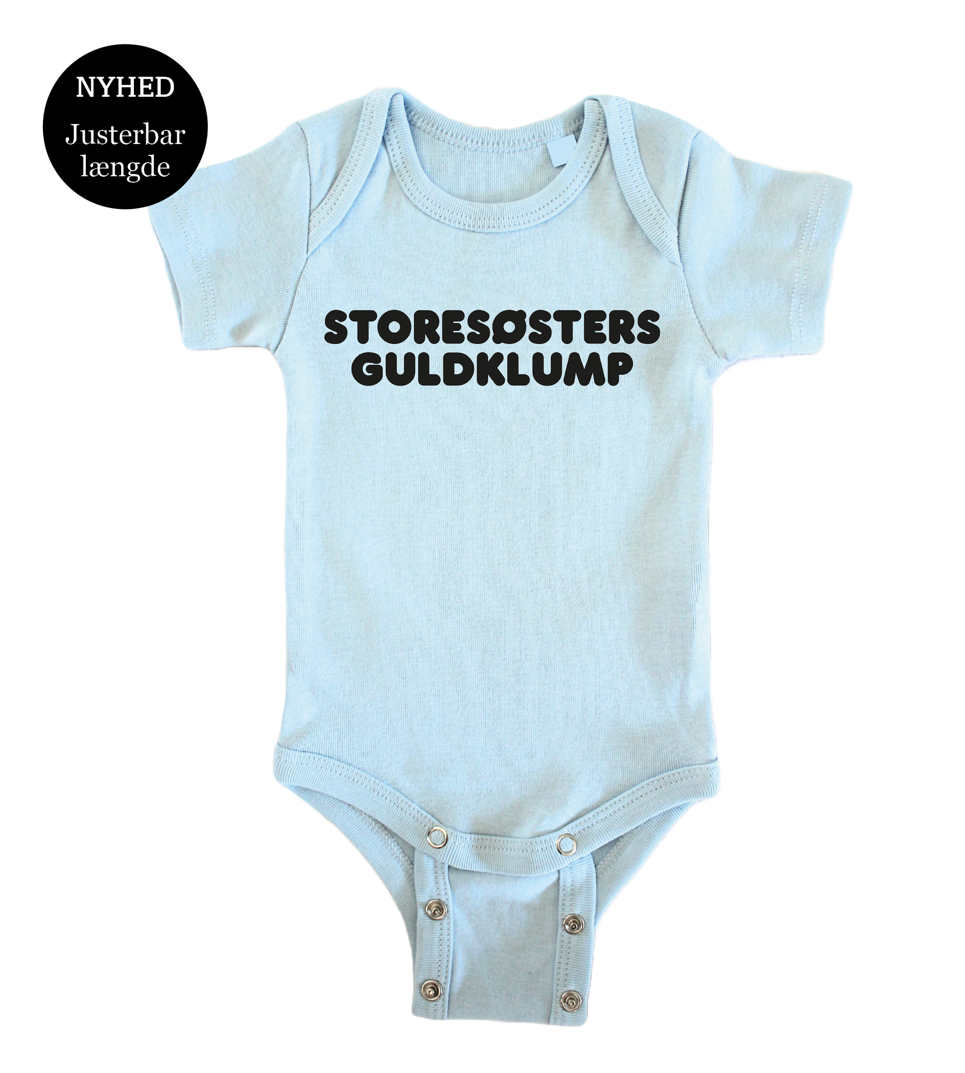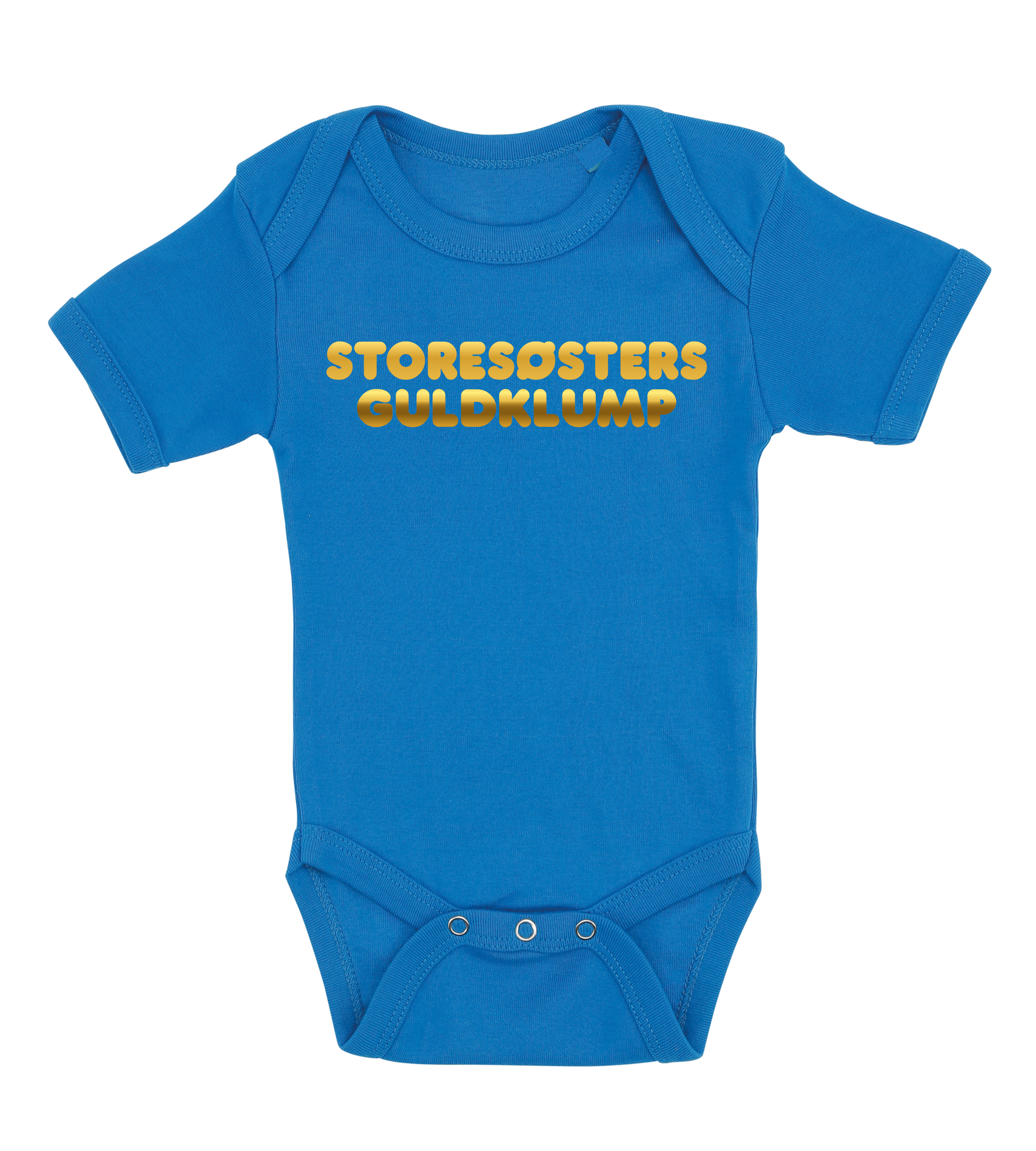 Denne baby bodystocking med teksten Storesøsters guldklump, er det perfekte køb til de kommende forældre, som venter sig en lille baby , som vil blive familiens guldklump, eller gave fra den stolte storesøster.